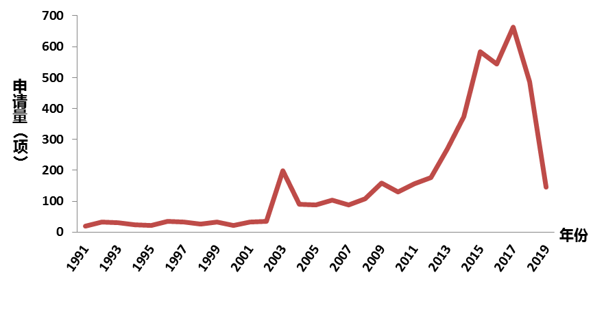 对于医用口罩产品,专利申请趋势与2003年的SARS疫情,2009年甲型H1N1流感疫情呈正相关。
