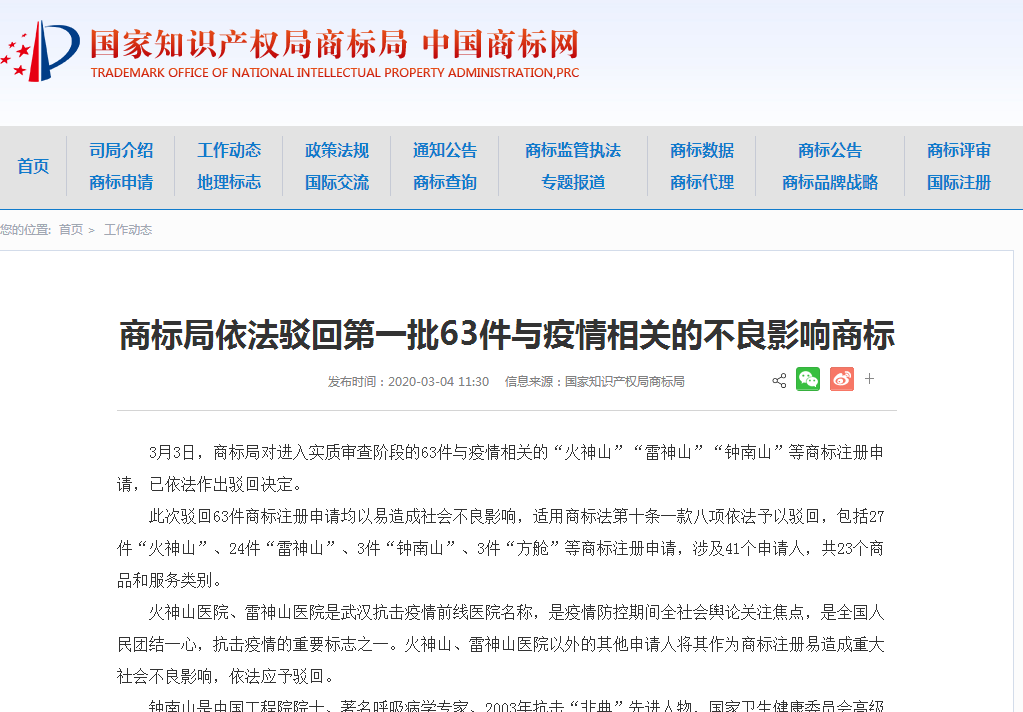 原标题:关于依法驳回“火神山”等63件与疫情相关具有不良影响商标的公告