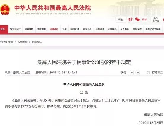 《最高人民法院关于修改<关于民事诉讼证据的若干规定>的决定》已于2019年10月14日由最高人民法院审判委员会第1777次会议通过,现予公布,自2020年5月1日起施行。