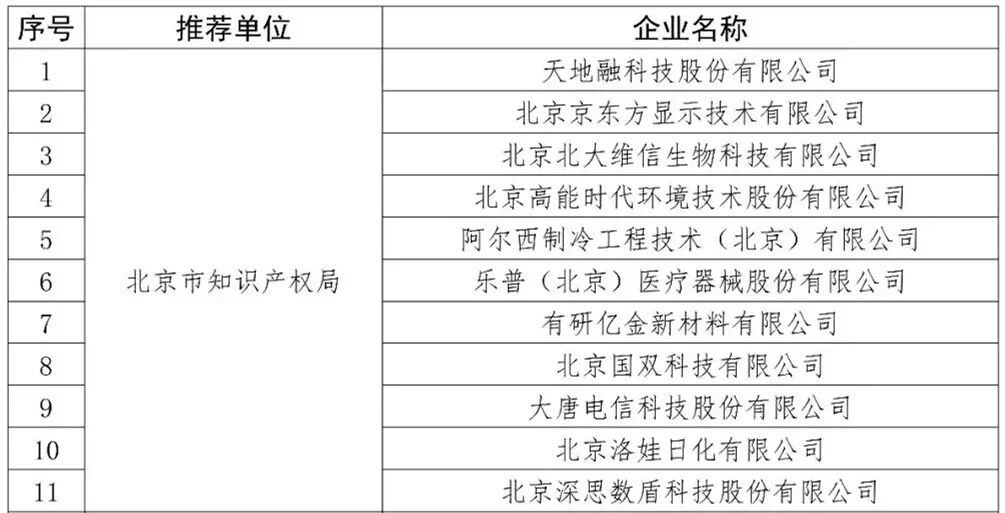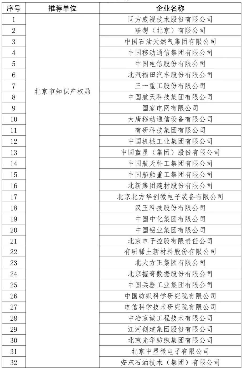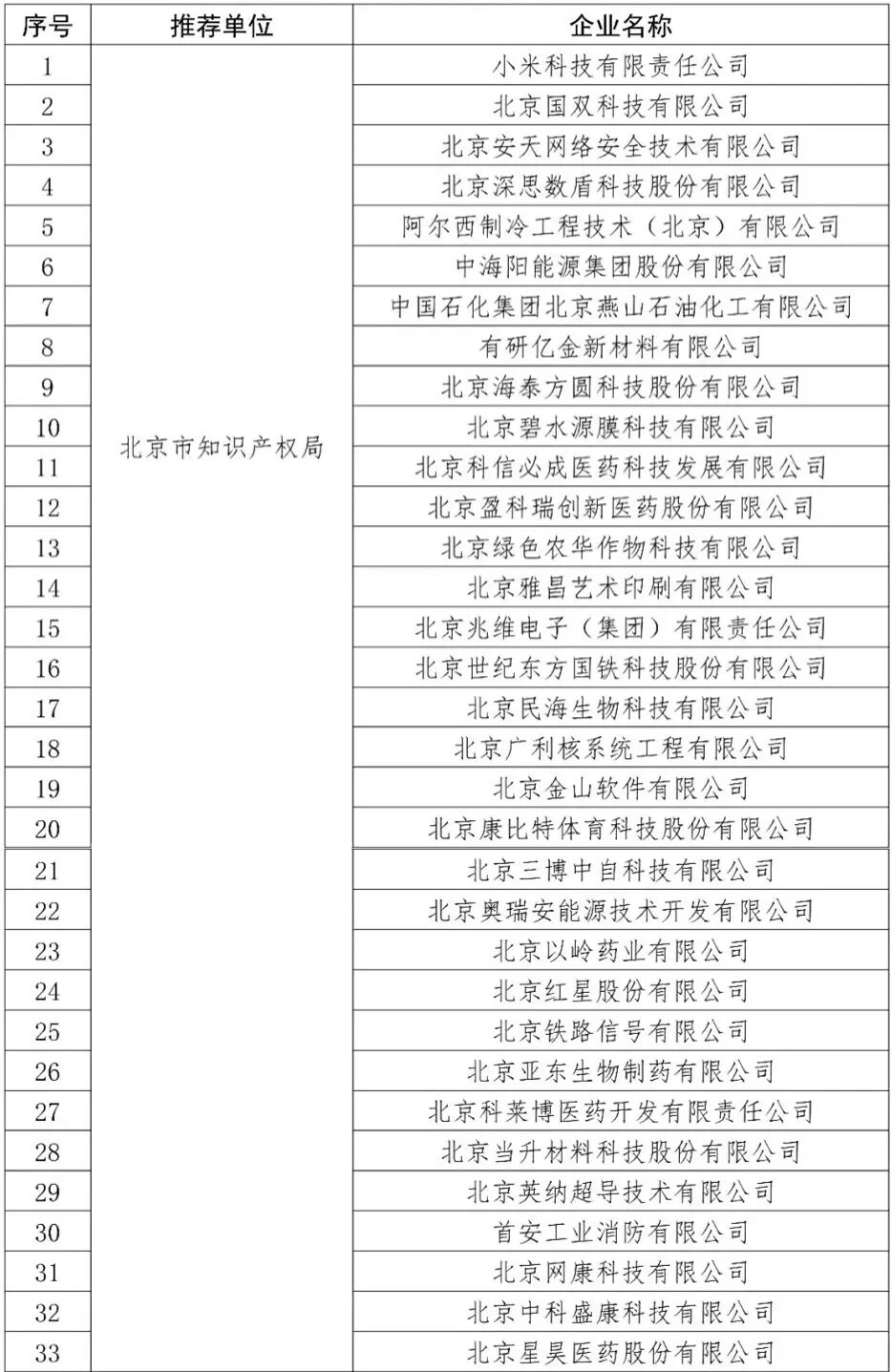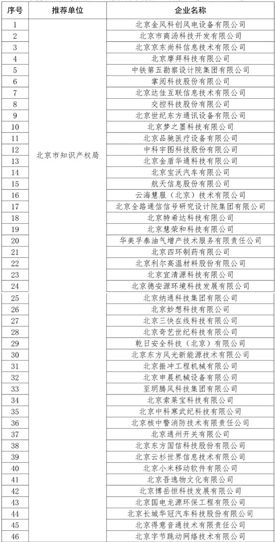 通知附件的名单中显示,2019年度国家知识产权示范企业274家,其中,北京企业11家;2019年度国家知识产权优势企业1965家,其中,北京企业46家;2013 年度、2016年度国家知识产权示范企业通过复验名单包含企业217家,其中,北京企业32家;2013 年度、2016年度国家知识产权优势企业通过复验名单包含企业791家,其中,北京企业33家。