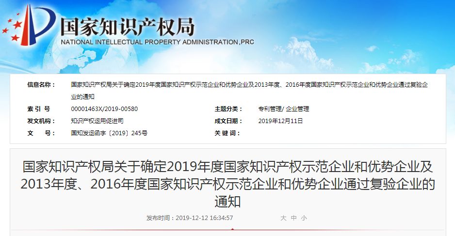 近日,国家知识产权局发布通知,确定2019年度国家知识产权示范企业和优势企业及2013年度、2016年度国家知识产权示范企业和优势企业通过复验企业。