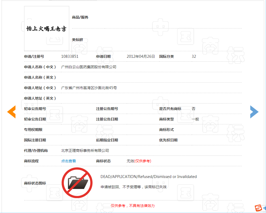广州医药集团有限公司(以下简称广州医药)于2012年4月26日申请了第10833851号“怕上火喝王老吉”商标,指定使用在第32类,啤酒,果汁,水(饮料),无酒精饮料,植物饮料,汽水,饮料制作配料等商品上。