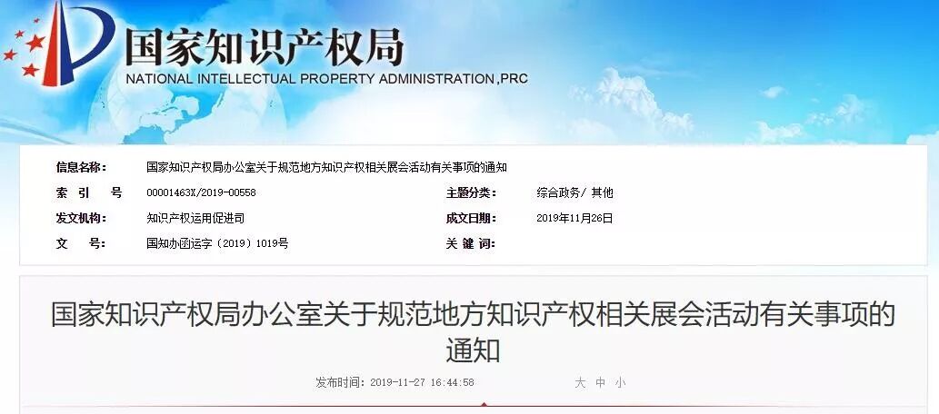 IPRdaily导读:11月27日,国家知识产权局网站发布了“关于规范地方知识产权相关展会活动有关事项的通知”。通知提到,为贯彻落实中央八项规定精神和《党政机关境内举办展会活动管理办法》,按照全国清理和规范庆典研讨会论坛活动工作领导小组《关于进一步做好党政机关境内举办展会活动专项整治工作的通知》(国清组函〔2019〕150号)要求,结合《邀请国家知识产权局领导出席政务活动及报告请示工作暂行规定》(国知发办字〔2008〕162号),现就涉及国家局或国家局人员参加的地方各类知识产权相关展会、节庆、论坛、大赛、研讨会等活动明确有关要求。