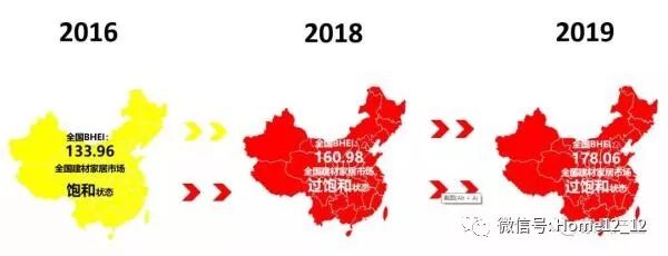 报告显示,2016年BHEI值为133.96,位于黄灯区,全国建材家居卖场处于饱和状态,2018年BHEI值为160.98,位于红灯区,全国建材家居卖场进入过饱和状态,而到2019年,全国BHEI值仍在上涨,进入持续的过饱和状态。