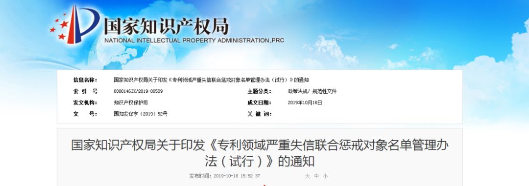 10月17日,国家知识产权局印发《专利领域严重失信联合惩戒对象名单管理办法(试行)》(下称《名单管理办法》),对专利领域严重失信联合惩戒对象名单管理工作予以规范,该办法将于12月1日起试行。