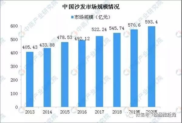 进入二十一世纪以来,我国沙发制造行业发展一直保持良好态势。2013年中国沙发市场规模突破400亿元,2018年市场规模增至545.74亿元。预计2020年沙发市场规模将逼近600亿元。