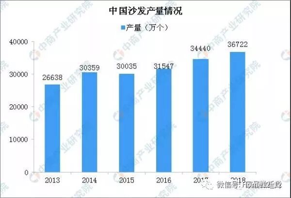 中国是全球最大的沙发需求市场之一,同时中国具有丰富的劳动力和原料资源,成为全球主要的沙发供给区域。近几年,我国沙发行业产量稳步增长,从2013年的26638万个增长到2018年的36722万个。