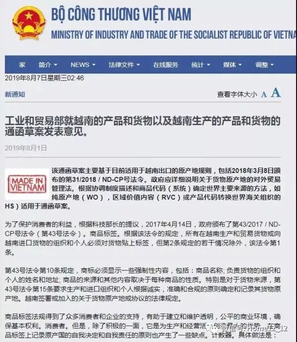 此前,越南工业贸易部发布的“越南制造”(原产地)标准草案规定: