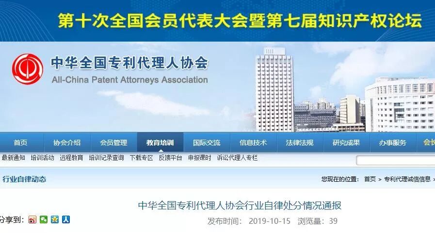 原标题:中华全国专利代理人协会行业自律处分情况通报