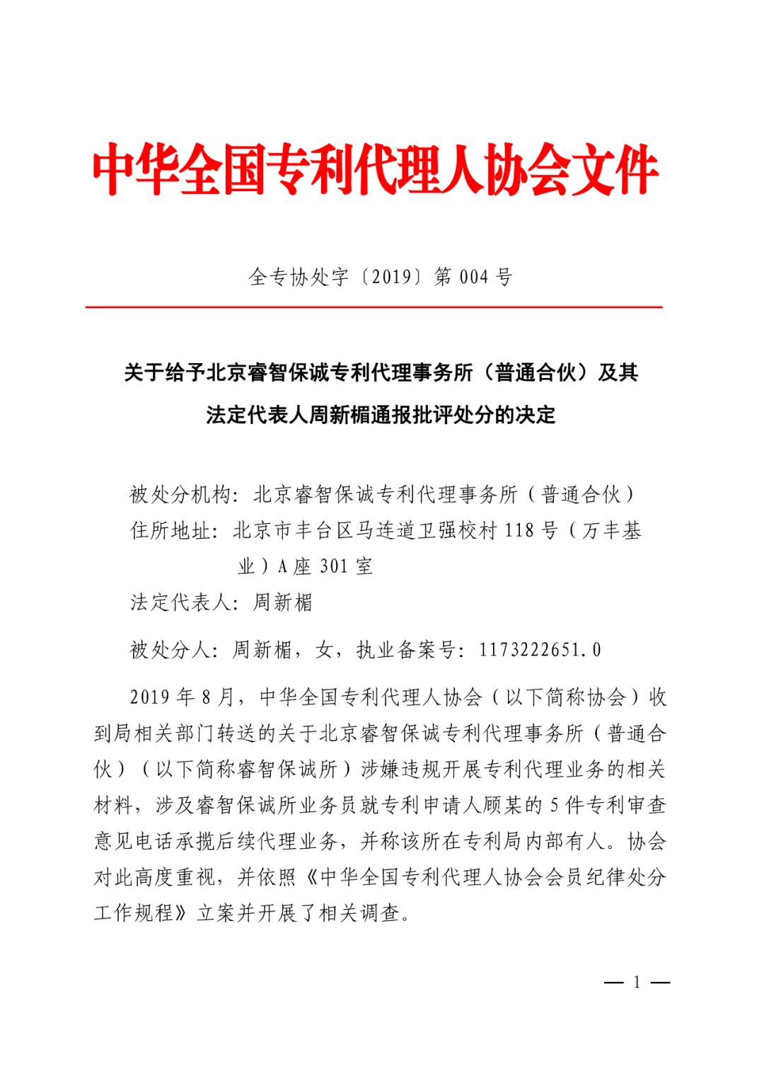 3、4号关于给予北京睿智保诚专利代理事务所(普通合伙)及其法定代表人周新楣通报批评处分的决定.pdf