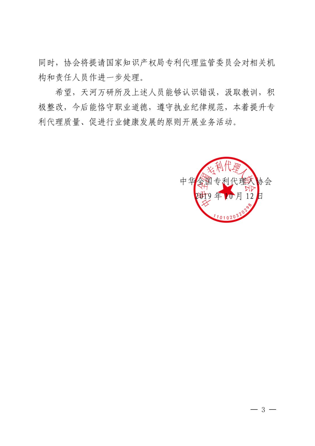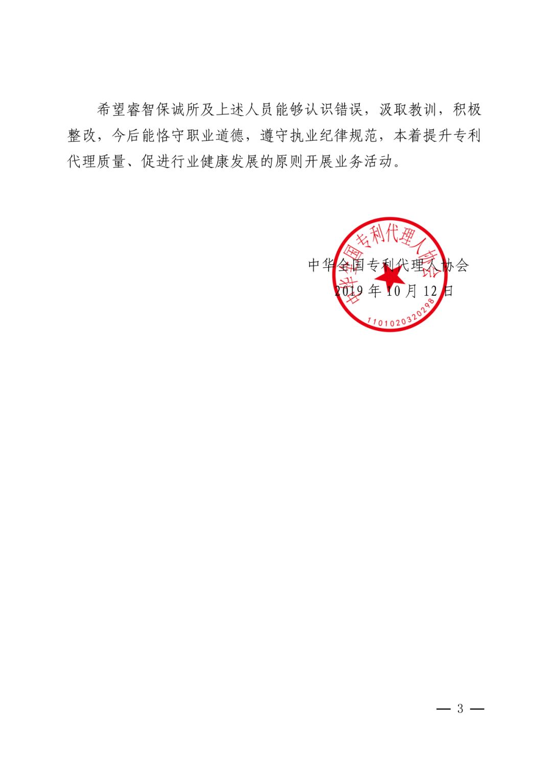 中华全国专利代理人协会行业自律处分情况通报