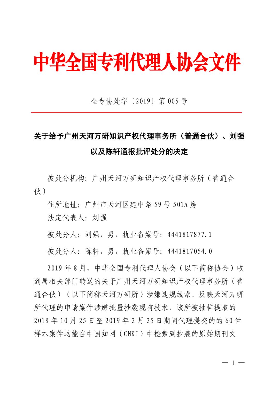 附件:1、关于给予广州天河万研知识产权代理事务所(普通合伙)、刘强以及陈轩通报批评处分的决定.pdf