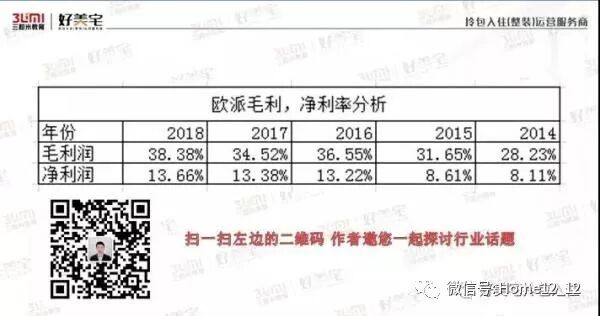 本以为2018年欧派橱柜,衣柜的单价会继续走低,但是报表显示,橱柜衣柜的平均单价都开始回升,其中橱柜单价增长0.93%,衣柜单价增长6.98%,同时毛利率和净利率2018年都是比2017年有所增加。(2018年毛利率38.38%,2017年毛利率34.52%,2018年净利率13.66%,2017年毛利率13.38%)