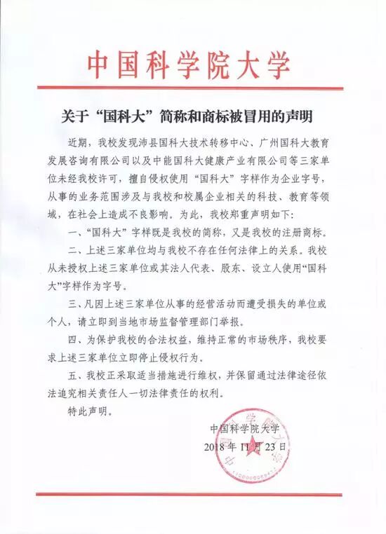 2018年,中国科学院大学发布声明称,有三家单位未经该校许可,擅自侵权使用“国科大”字样作为企业字号,在社会上造成不良影响。声明称,“国科大”简称和商标被冒用,该校正采取适当措施进行维权,并保留通过法律途径依法追究相关责任人一切法律责任的权利。