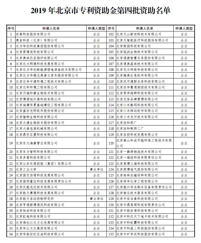 【知产动态】2019年北京市专利资助金第四批资助名单公示