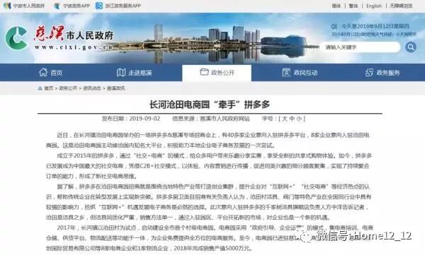 据慈溪市人民政府网站公告,近日在浙江省慈溪市长河镇沧田电商园举办的一场拼多多&慈溪专场招商会上,有40多家企业意向入驻拼多多平台,8家企业意向入驻沧田电商园。