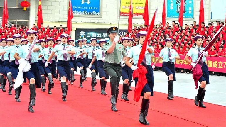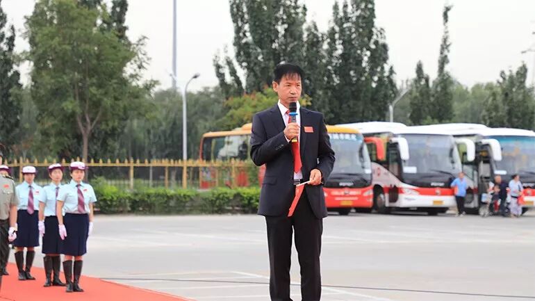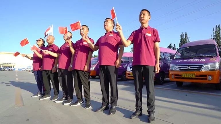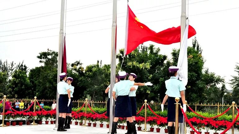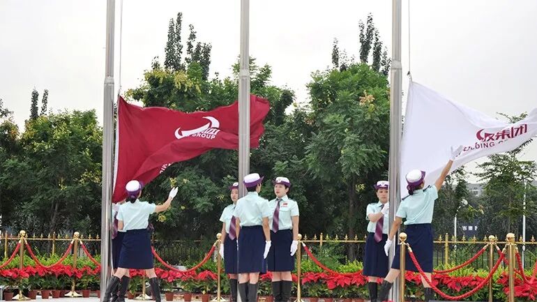 升旗仪式开始,奏国歌和企业之歌,仪仗队踏着铿锵有力的步伐,将国旗和集美集团的企业旗送到旗杆最顶端,所有参与仪式的人员齐行注目礼,向祖国致敬,向企业致敬。