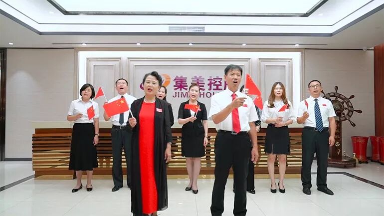 仪式最后,集体合唱《我和我的祖国》。歌曲高潮部分,全体参与人员激动欢呼。董事长赵建国、总裁刘志萍、集团高层和集美人纷纷走下台阶,广场上响起一片祖国万岁的欢呼声,表达了集美人对祖国的真挚祝福!