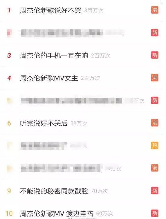 近日,周杰伦新歌《说好不哭》曝光,虽说周董是半夜发的新歌,可瞬间就刷爆微博和朋友圈,高峰时段周杰伦和新歌狂霸微博热搜前十条中的六条。