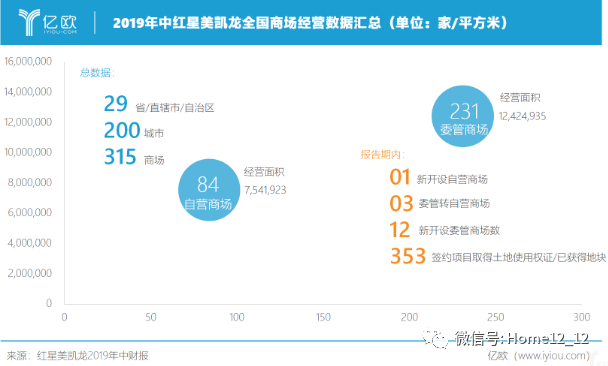 截至2019年6月30日,红星美凯龙在国内29个省、直辖市、自治区的200个城市经营了315家商场,总经营面积约为19,966,858平方米,其中包含84家自营商场和231家委管商场。84家自营商场面积达到7,541,923平方米,231家委管商场,总经营面积12,424,935平方米。