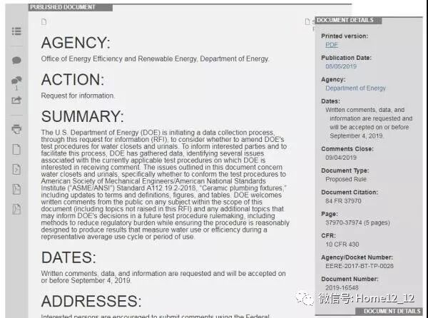 书面评议和征求信息截止日期为2019年9月4日。(来源:厨卫资讯)