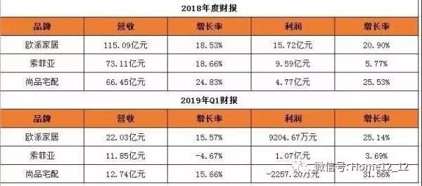 欧派家居、索菲亚、尚品宅配2018年度、2019Q1财报关键数据
