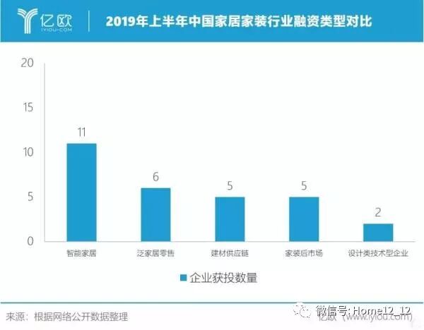 亿欧家居发布的家居行业2019年中投资盘点显示,在 2019上半年39家获得融资的家居家装企业中,有11家智能家居公司,占总体融资数量的28%,是细分领域里融资项目最多、金额最高的赛道。