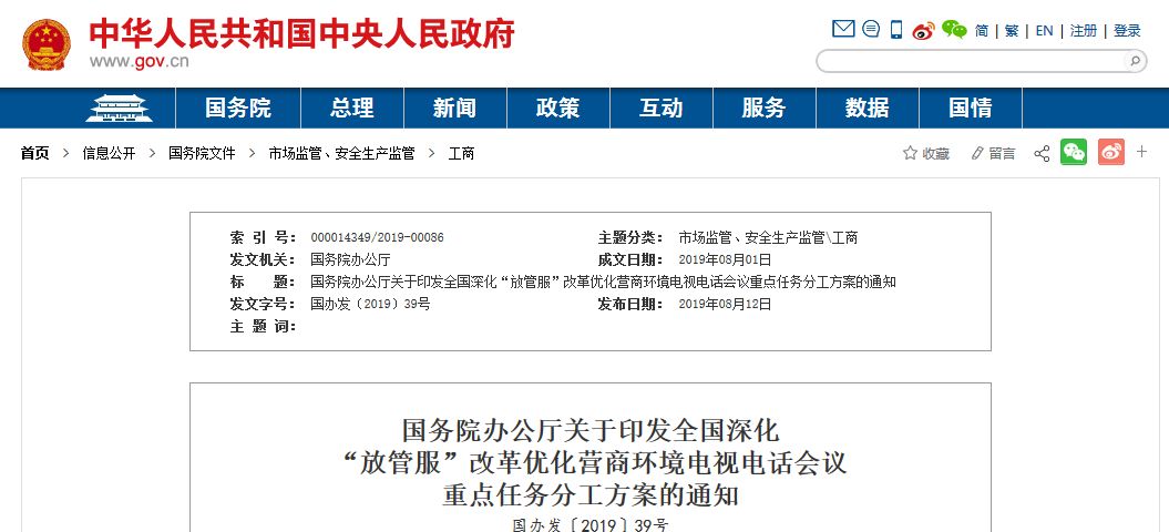 8月12日,国务院办公厅发布了关于印发全国深化“放管服”改革优化营商环境电视电话会议重点任务分工方案的通知。