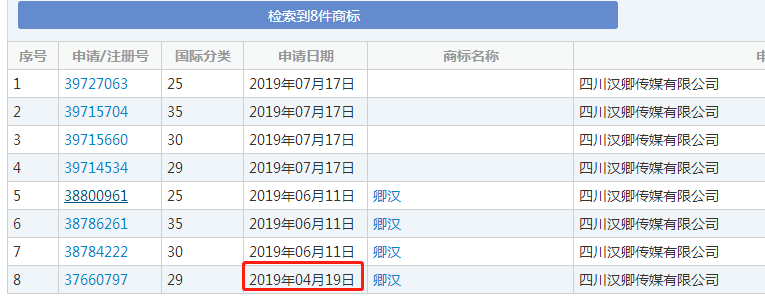 2014年开始拍视频,2016粉丝达百万。2019年4月才开始递交第一个商标“卿汉”,目前还在实审中。最近也递交了几个商标,目前还在受理中。(这也是众多初创企业或UP主会遇到的问题:知识产权保护意识淡薄,前期一心忙着研发,创作高质量的产品;等到稍有名气,相关知识产权被抢注。)