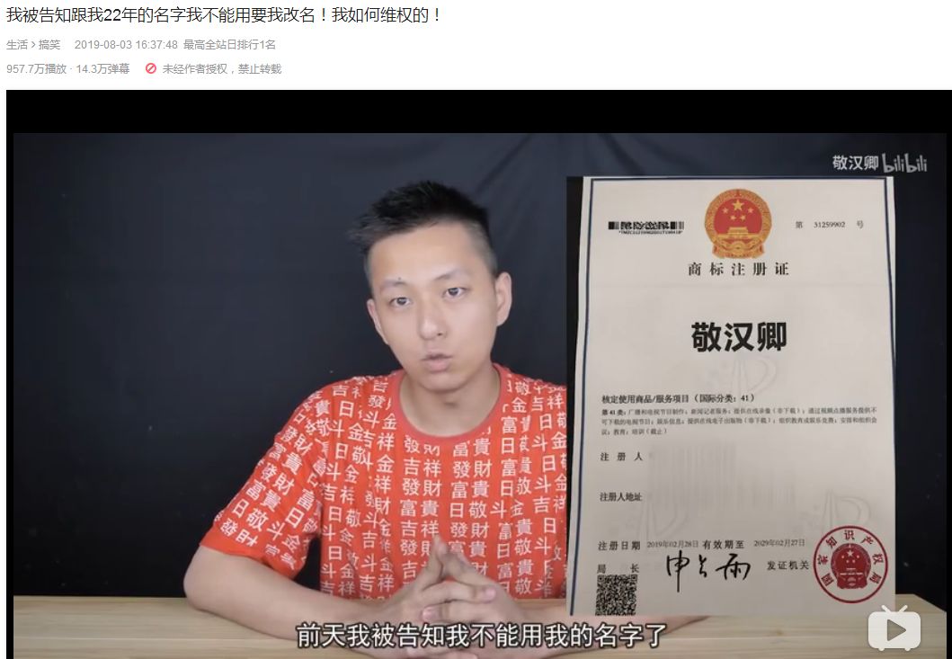 IPRdaily导读:近日,B站知名UP主敬汉卿接到一份律师函,被告知不能使用自己的名字。原来,有一家所谓的企业注册了“敬汉卿”三个字的商标,并告知up主敬汉卿侵权,要求up主停止侵权行为,不然律师函警告!
