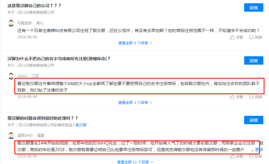 据UP主敬汉卿视频中介绍:目前已经收集“敬汉卿”所有使用证据,通过正规渠道维护自己合法权益。对商标进行无效宣告等。