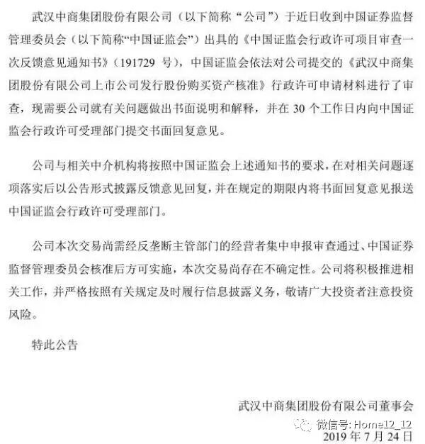 7月24日,武汉中商发布公告,表示已收到证监会出具的反馈意见书,就武汉中商发行股份收购居然之家的交易进行了审查,并将在30个工作日内就证监会提出的相关问题做出书面说明和解释。