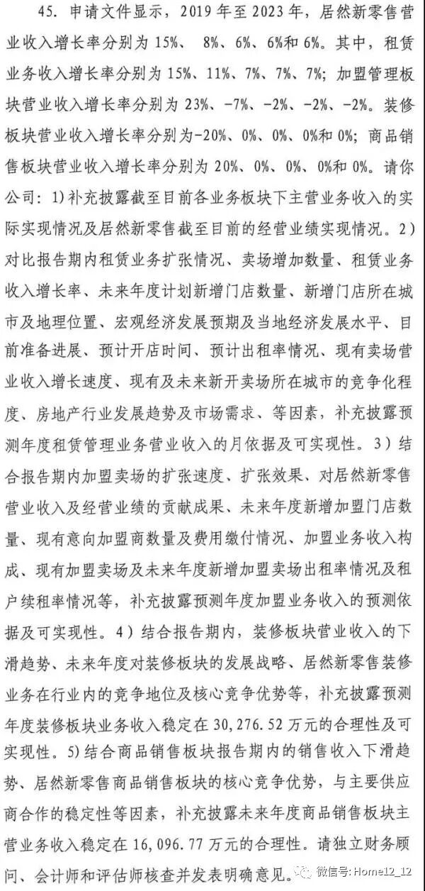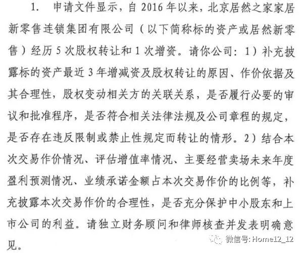 根据第一家具网梳理,此次证监会提出的问题共有57条,涵盖居然之家股权变动、实控人业绩承诺,居然之家直营店、加盟店的运营、出租率、关店情况,以及经销商续约率问题等等。