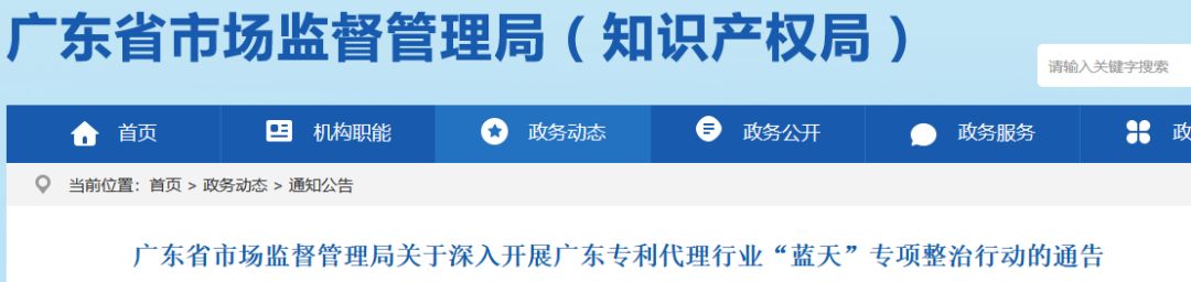 广东省市场监督管理局发布开展广东专利代理行业“蓝天”专项整治行动通告