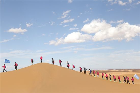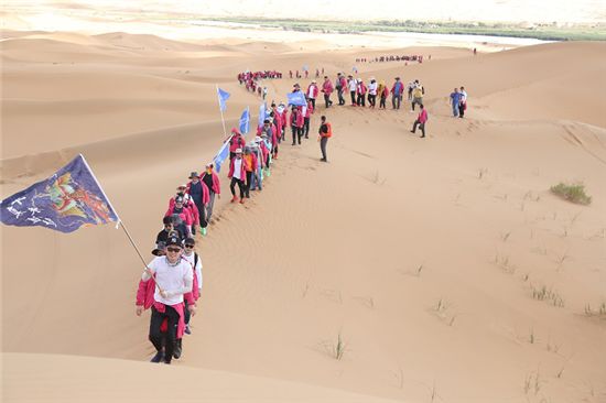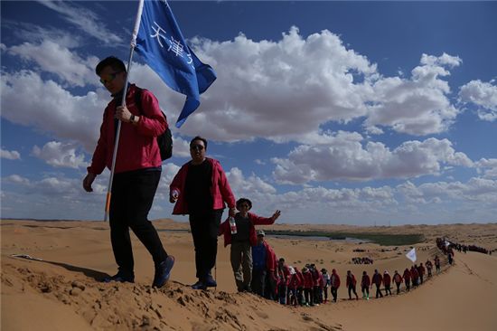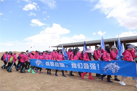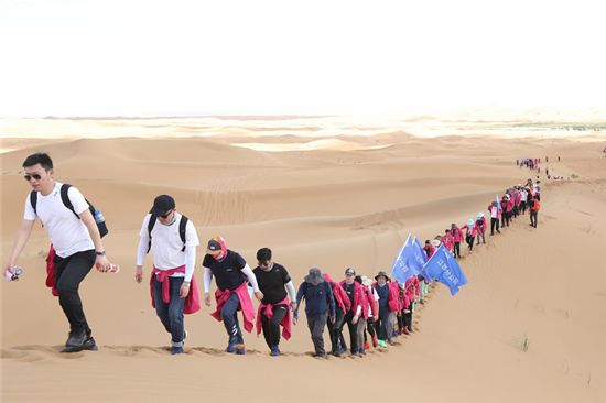 下午,大队人马于月亮湖对岸的沙漠出征点集合,所有人被分为八队,在王宁总裁作出征鼓励并擂鼓发布出征令后,全体人员开始沙漠徒步5公里极限挑战。