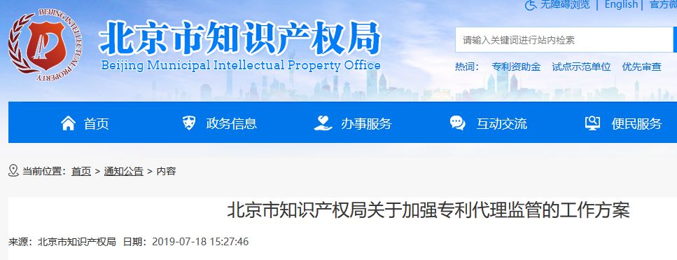 7月18日,北京市知识产权局发布关于加强专利代理监管的工作方案。方案提到: