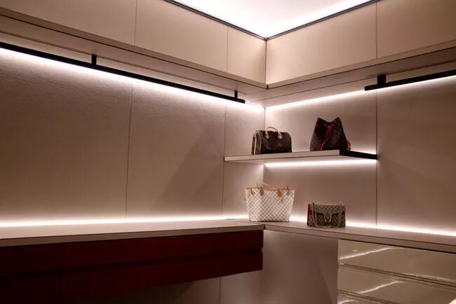 还有全透明玻璃的衣帽间设计,设计师表示,玻璃具有透视效果,能扩大空间的视觉效果,让有限的空间显得比较宽敞。