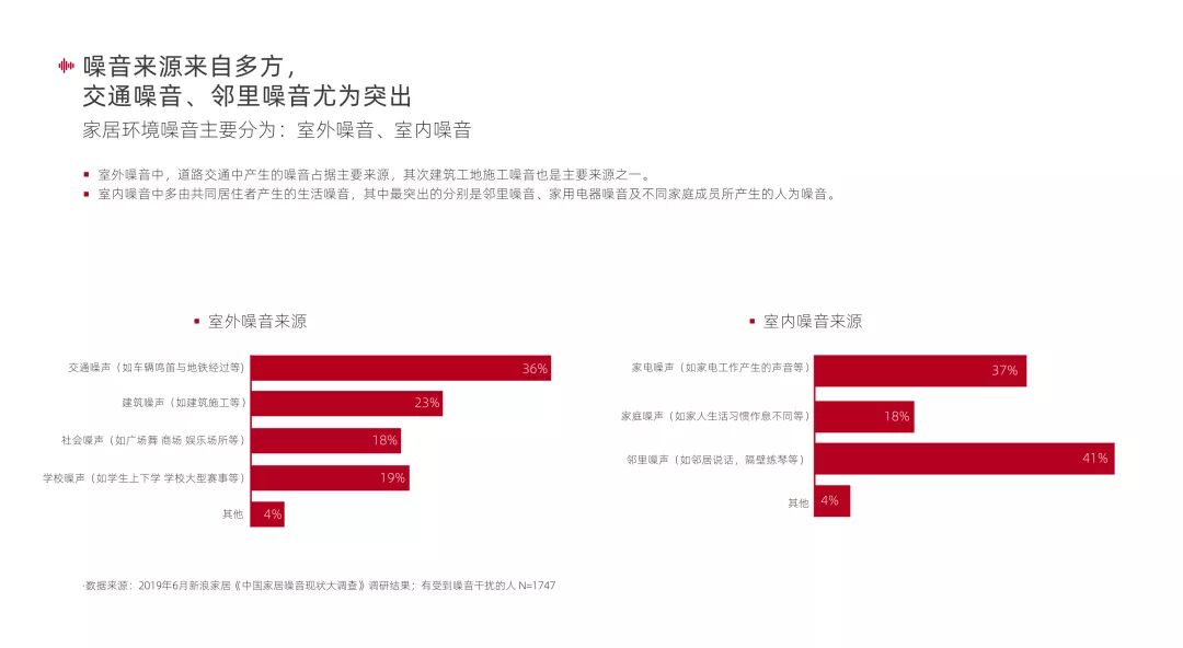 家居环境噪音分为室内噪音和室外噪音。调查显示,道路交通中产生的噪音(如车辆鸣笛与地铁经过等)和邻里噪音(如邻居说话、隔壁练琴等)分别是室外噪音和室内噪音的最大来源。