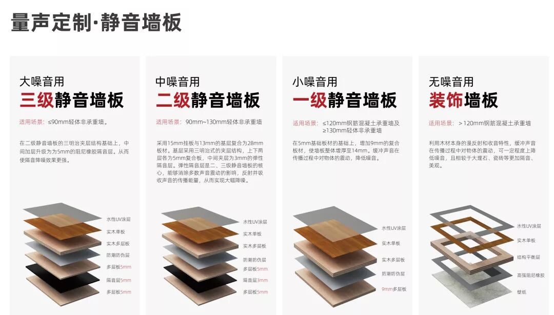 TATA每类产品根据隔绝噪音的程度分为不同等级,根据每个家庭不同的情况,搭配相对应的级数产品。