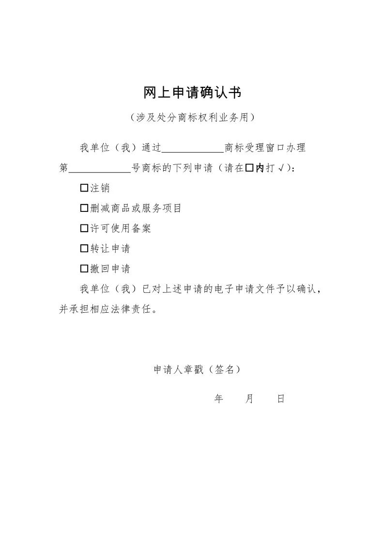 网上申请确认书 涉及处分商标权利业务用.docx