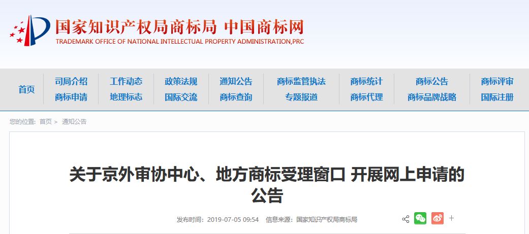 IPRdaily导读:7月5日,国家知识产权局商标局发布“关于京外审协中心、地方商标受理窗口 开展网上申请”的公告。公告提到:为继续深化商标注册便利化改革,使申请人充分享受改革红利,京外审协中心和地方商标受理窗口已于2019年6月21日全面开展网上申请。