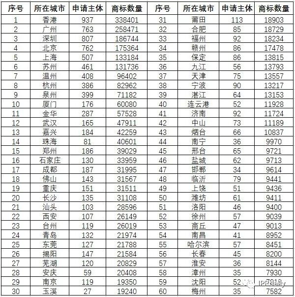 所在城市的疑似恶意申请主体的人数、持有商标总数,按商标总数排序、选择前60个城市公布数据。详细数据如下: