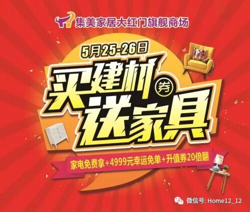 5月25日-26日买建材送家具代金券的活动,不仅是建材品类及家具品类的完美联动,更是让消费者能在购物期间感受到实实在在的优惠。消费者可以关注小程序,抢购20倍翻升值券。更有满额送好礼,家电免费拿活动以及终极抽大奖等活动让参与的顾客惊喜连连,满载而归。