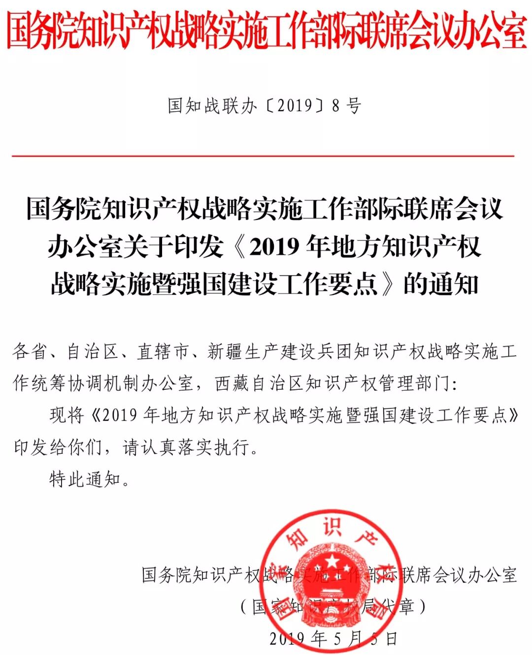 2019年5月13日,国务院知识产权战略实施工作部际联席会议办公室发布了关于印发《2019年地方知识产权战略暨强国建设实施工作要点》的通知。