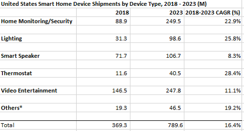 据市场研究公司IDC预测,2023年美国智能家居市场将增长到7.896亿台,这将是2018年出货量的两倍多。IDC表示,这一增长大部分将来自智能音箱和智能电视,其次是家庭安全设备。