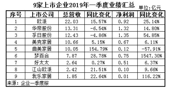 本周,9家上市家居企业发布2019年一季度公司季报,业绩汇总如下: