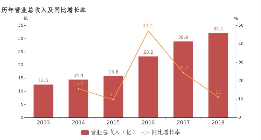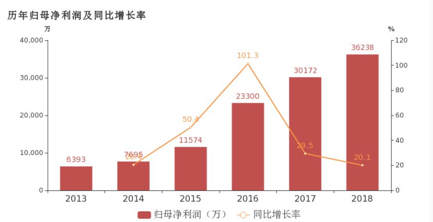 数据显示公司2018年实现营业总收入32.1亿,同比增长11%;净利润达3.6亿,同比增长20.1%,增幅连续5年保持在19%以上。