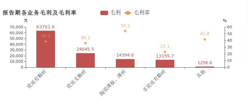 公司毛利率较高的瓷质有釉砖、薄板、薄砖等产品占比提升,带来了毛利率的提升。年报显示,企业综合毛利率为36.8%。其中,“瓷质有釉砖”、“瓷质无釉砖”、“陶瓷薄板、薄砖”毛利贡献占比分别为54.4%、21%、12.3%。