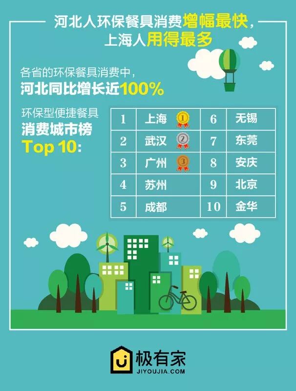 同样在这一榜单中,上海成为最爱环保便捷餐具的城市,武汉人买环保餐具把自己“买”到了全国第二。广东和江苏各有两城市上榜。