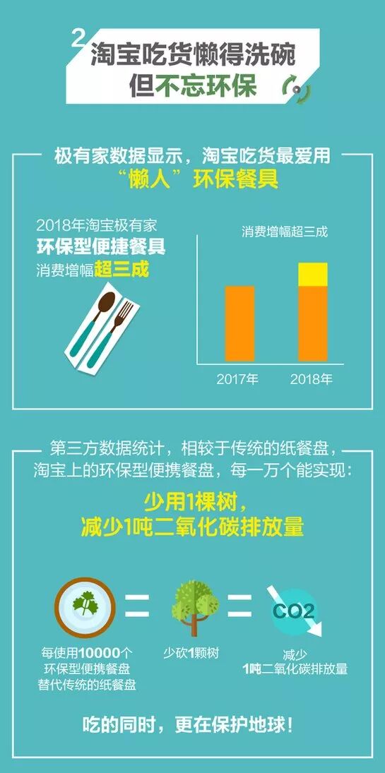 除了装修,在更日常的餐具方面,环保也成主题词。长期困扰地球的一次性餐具,正被淘宝上的环保型便捷餐具快速取代。第三方数据统计,每一万个环保型便捷餐盘,就能“拯救”一棵树、减少1吨二氧化碳排放。据此换算,单单是淘宝吃货们用的餐具,一年就相当于多种了8万棵树。可见,淘宝吃货不仅爱吃、会吃,更学会了在吃完饭后“偷个环保懒”,用环保型便捷餐具免去洗碗“痛苦”。